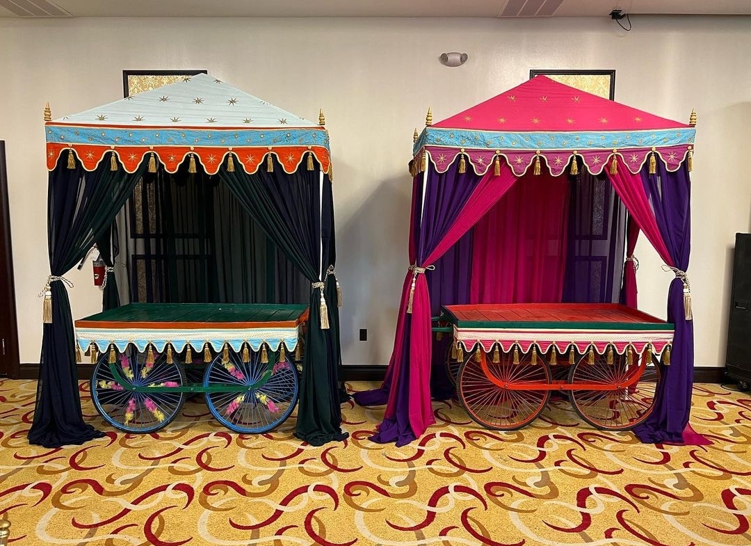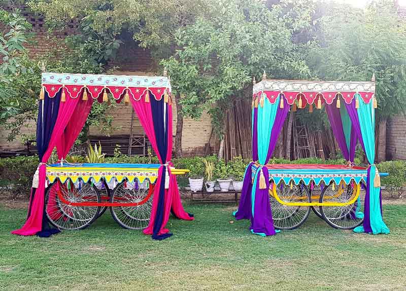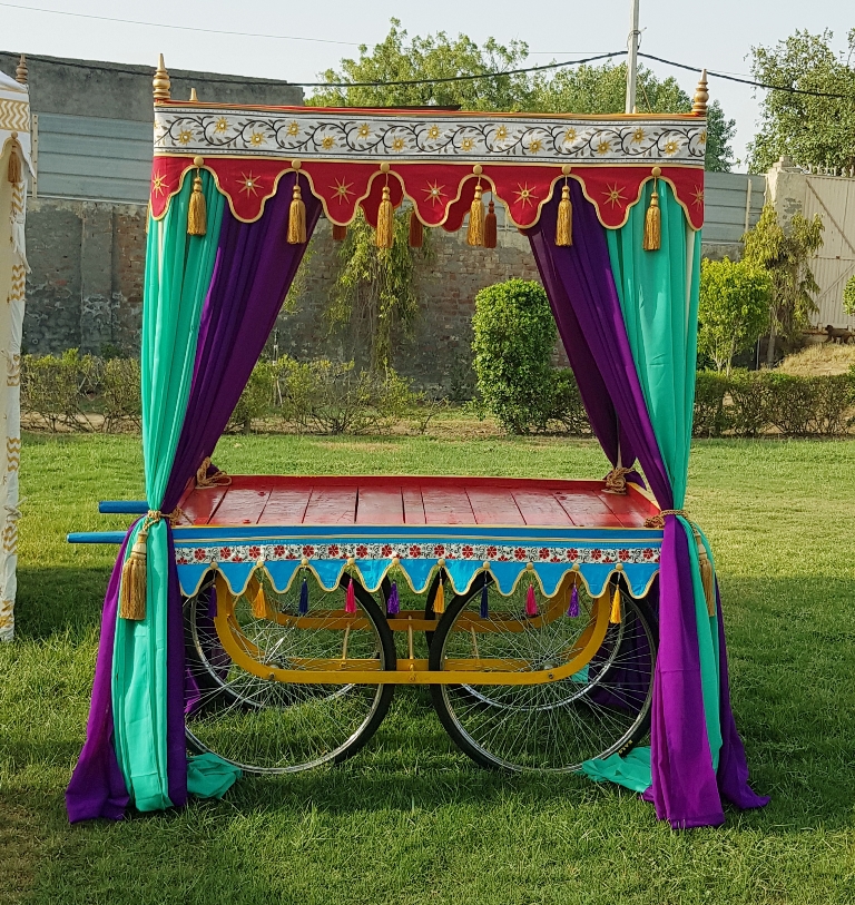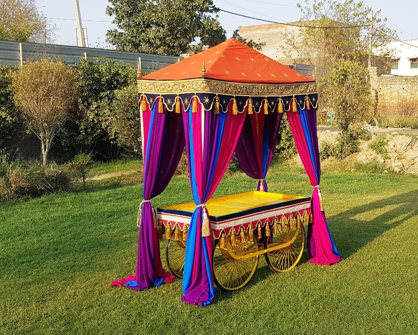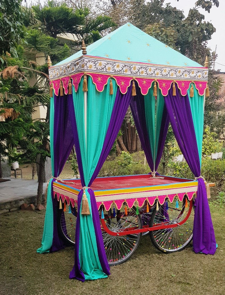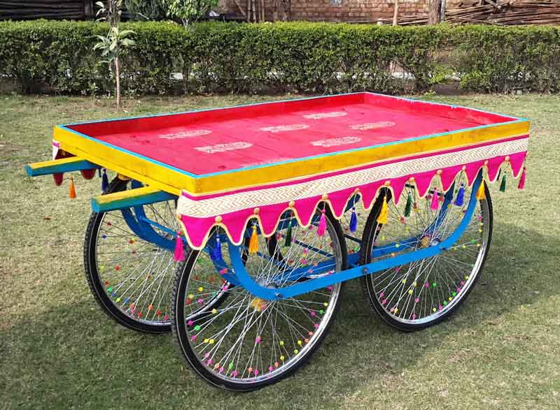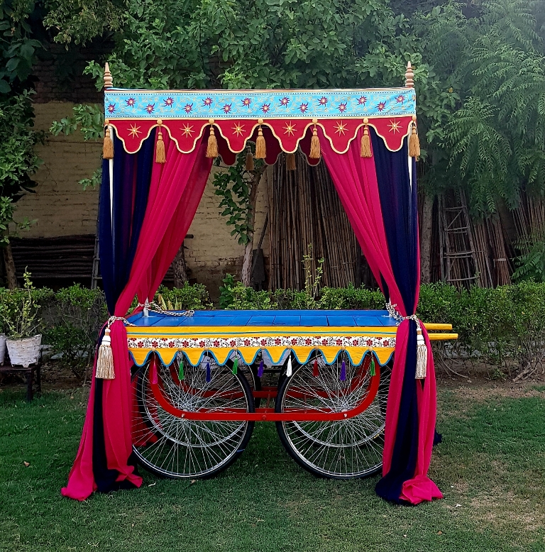 Indian Push Cart, Vegetable Cart, Thela or Redi as we commonly know it, has undergone a complete transformation in our factory. We now present to you a beautifully hand painted and decorated Food Cart and Decorated Rickshaw. At most Indian Weddings it is being used as Juice Bar, Coconut Water Counter, Golgappa Thela or Bangle Stall. This traditional push cart is not only bright and colorful but also reminds us of our rich culture and history. We offer a few options, Food Cart with the Flat roof Tent, with a peak top tent or just plain Push Cart. Kindly email us your enquiry. Our Jago items and Stage Decoration items for your sangeet night and mehandi function are a super hit with our clients.