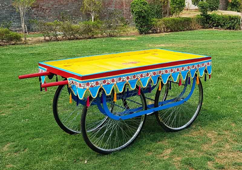 Indian Push Cart, Vegetable Cart or Redi as we commonly know it, has undergone a complete transformation in our factory. We now present to you a beautifully hand painted and decorated Food Cart. At most Indian Weddings it is being used as Juice Bar, Coconut Water Counter, Golgappa Thela or Bangle Stall. This traditional push cart is not only bright and colorful but also reminds us of our rich culture and history.