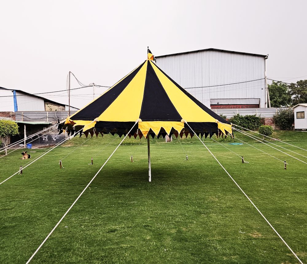 This Tent finds its origin in the Military Camps of the Middle Ages, depicted in a number of paintings and sketches. This tent was earlier used in wars as small military camps for armor storage and also in fairs and festivals during happier times. Now days this tent is extensively used in Medieval Festivals as Medieval re-enactments. It comes in a variety of colors, or Alternate stripes of two or three colors. The Tent is also called the Round Pavilion.